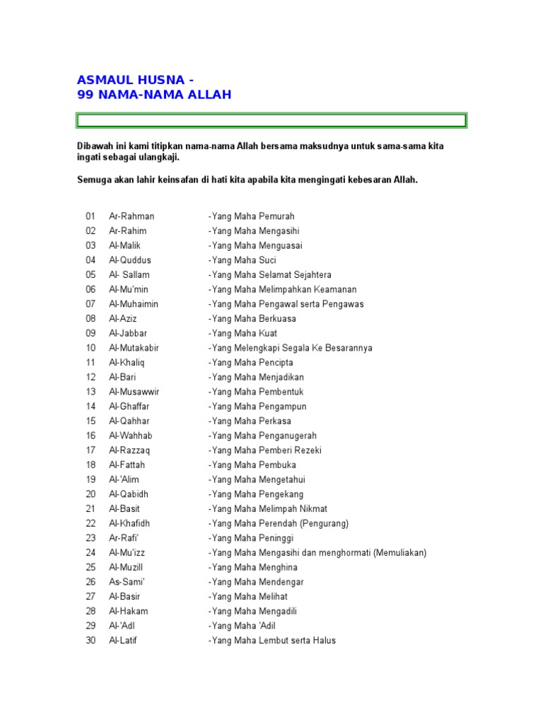 Asmaul husna 99 nama allah dalam bahasa arab rumi dan maksud serta penerangan dalam bahasa melayu. Misal seperti Asmaul Husna Amelia Husna Fairuz Husna Tiara Husna. Nama-nama indah Allah ini juga mempunyai sifat kemuliaan dan kesempurnaan.